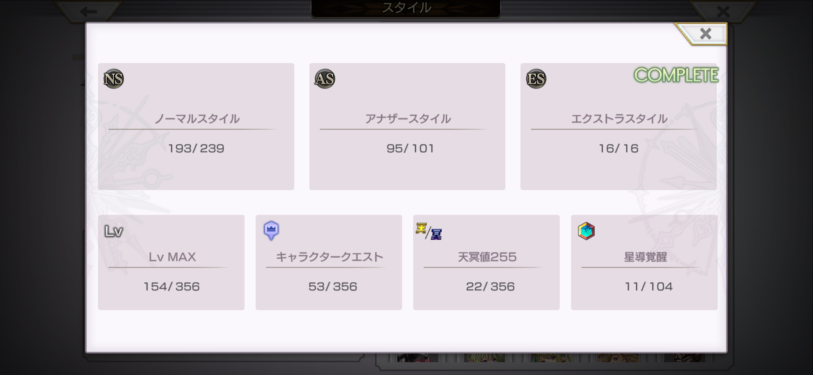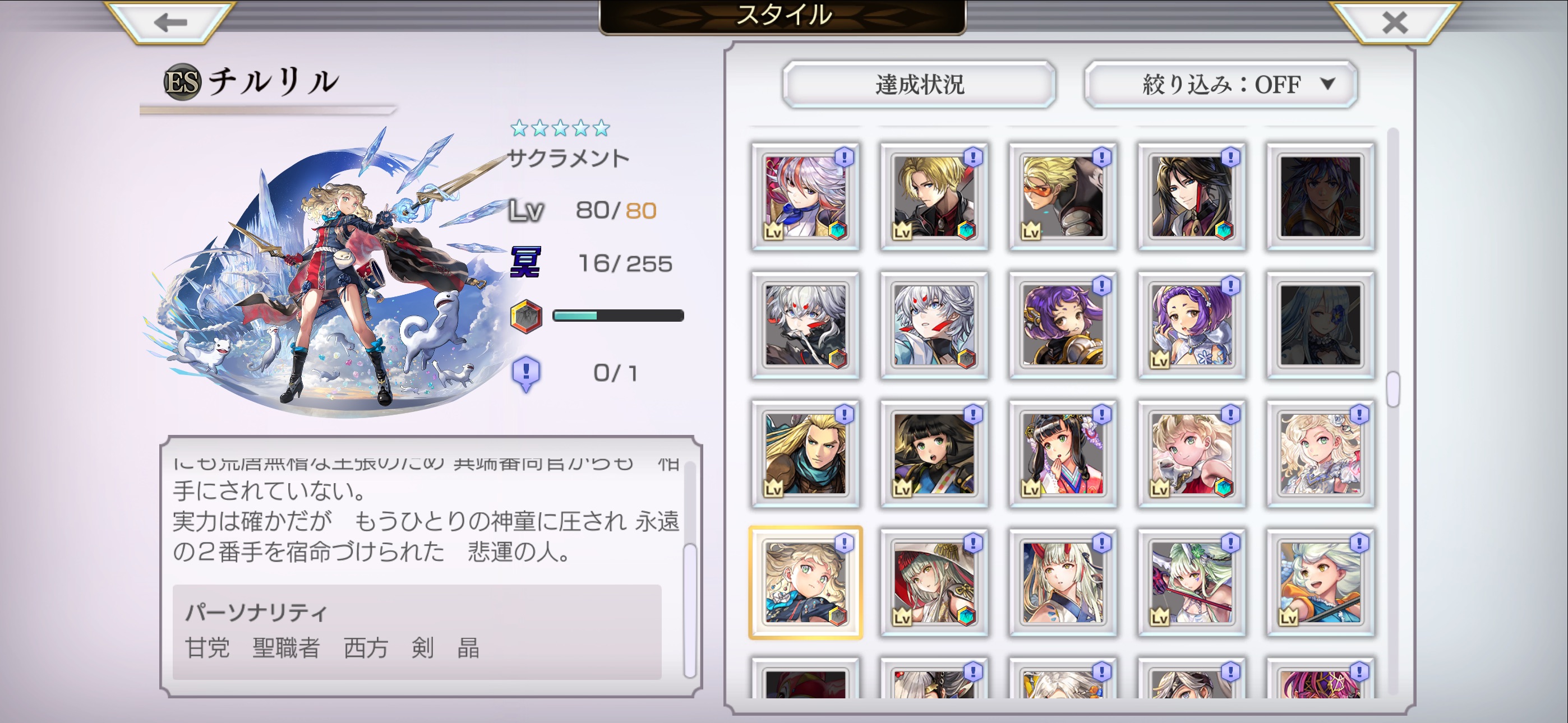 キャラクターとの出逢いや、スタイルごとの達成状況を確認することができます - 「並び替え」の項目を調整し、表示順に「降順」を追加しました