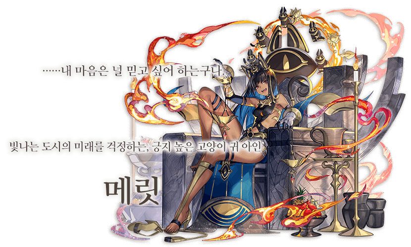 최대 HP 50% UP + 크리티컬율 300% UP 전방에서 턴 시작 시 자신의 전방 양옆에 불 속성 아군이 있는 경우 자신에게 혁작의 심장 축적 + 턴 종료 시까지 루나틱(솔선) 부여 ※턴 시작 시 메릿이 행동 불가인 경우 소비 |