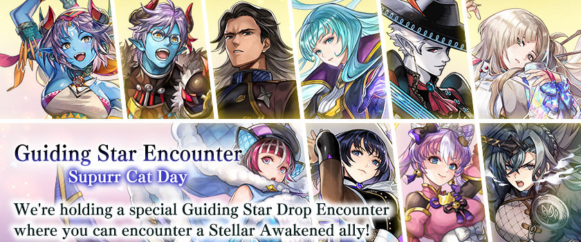 Encounter 10 allies, then obtain a "Guiding Star Drop" that can be used to encounter 1 Stellar Awakened 5★ class ally! *The expiration date of the Guiding Star Drop is 30 days from the time of initiating the "Guiding Star Encounter." *Guiding Star Drops obtained before version 3.14.20 cannot be used for the version 3.14.20 "Guiding Star Drop" Encounter. In this Encounter, you can obtain Supurr Cat Day Star Trails. <Guiding Star Drop> Use the Guiding Star Drop to encounter one of the following Pick-Up Bonus Eligible 5★ class characters. ・Hismena Extra Style (Fragarach) ・"Porcelain Pixie" Myunfa Another Style (Shashthi) ・Verdanta ・Silver Striker Another Style (Naivete) ・Clughorn ・Mildy ・"Dream Weaver" Dunarith Another Style (Dionysus) ・Nina ・Azure Retainer ・Myrus Extra Style (Unut) ・Black Clad Sw. Another Style (Étoile) ・Raven Another Style (Prophet) ・"Ruby-Sleeved Merchant" Shigure ・Cyan Scyther Another Style (Sweet Lady) ・Linaria ・"Selfless Seeker" Laclair ・Red Clad Flam. Another Style (Last Haven) ・Velette Another Style (Archaeologist) ・Shion Extra Style (Futsunomitama) ・Nilya |