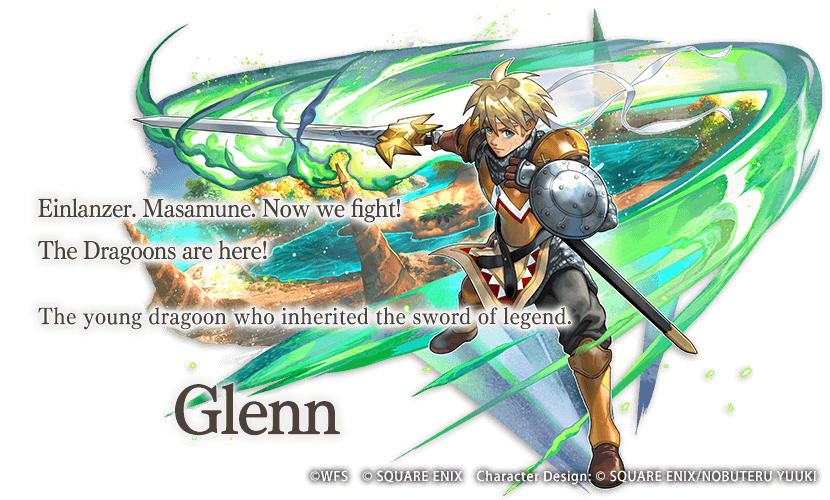 Together with Serge, Kid, Harle, and Starky, Glenn—protector of the El Nido Islands and member of the Acacia Dragoons—ends up lost in another world's Kingdom of Miglance.