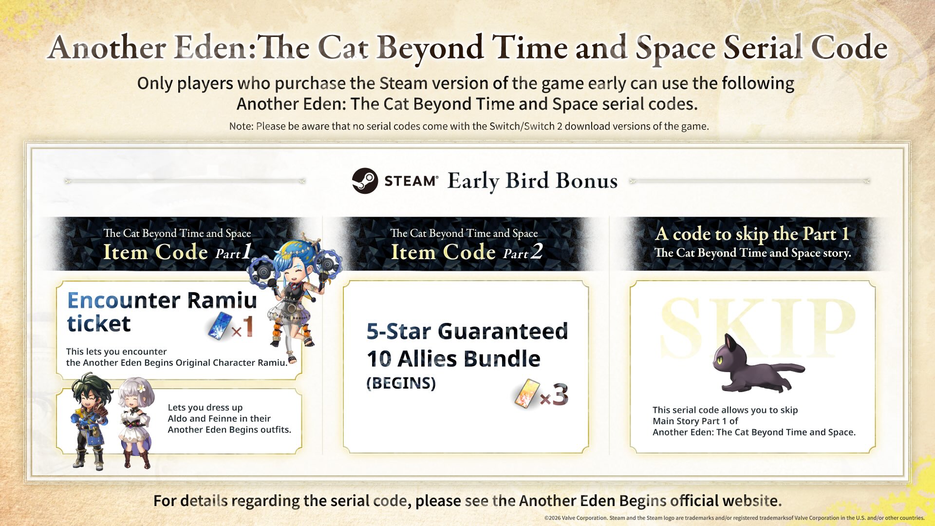 Only players who purchase the Steam version of the game early can use the following Another Eden: The Cat Beyond Time and Space serial codes.